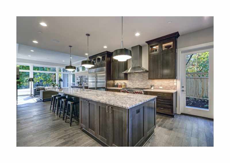 The looks of wood grain on all of the cabinets in this kitchen played an important part to decide the design of this kitchen. Dark green also played its part beautifully as the kitchen backsplash wall.