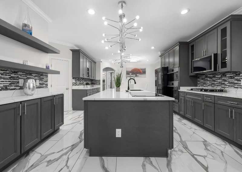 This one type of dark grey color won’t bother the luxury or glamour of your kitchen. That dark shades emphasize the furniture design. The white marble island countertop provides an outstanding match to the entire scheme.