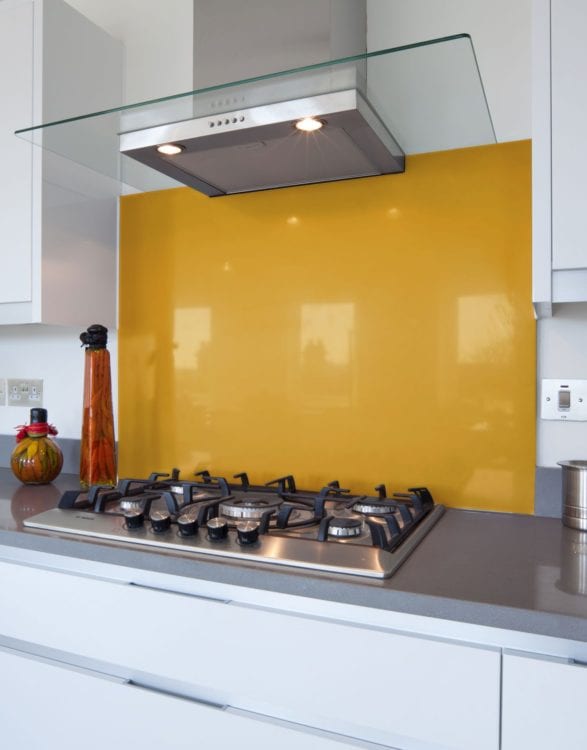The glass sheet backsplash in this kitchenette serves up a healthy dose of pineapple yellow. It stands out against the black countertop and white cabinetry.